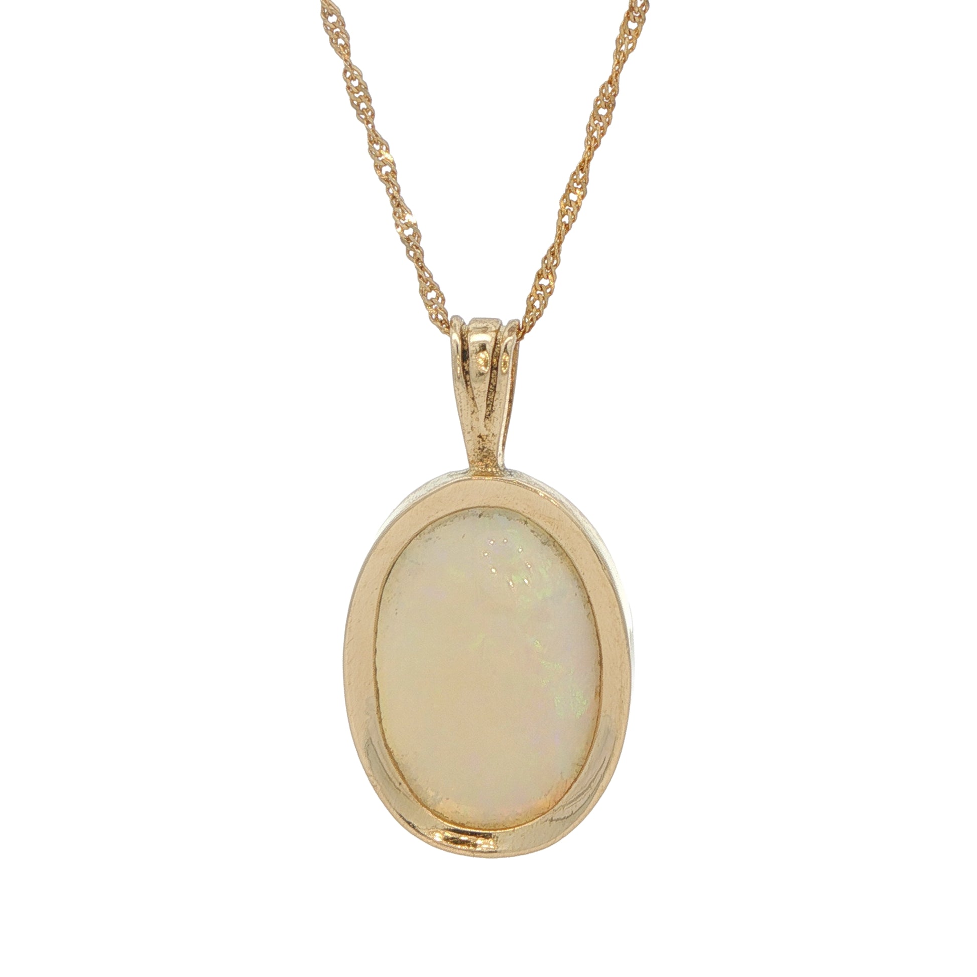 One set stamped 10-14KT yellow gold hand assembled custom made solitaire pendant and chain. The chain is 17.0" long, light twisted curb link with a spring ring clasp and a high polish finish. Containing: One white opal that is cut in an oval shaped cabochon and is claw set, measuring 16.00 mm long x 11.00 mm wide, and a 3.45 mm thick and the approximate weight is 3.79 carats. The opal has a somewhat bright, multicolor play of color (fire) in a broad flashfire pattern; a low dome; a good cut; no inclusions; minor dull spot in its brightness and pattern; and is not directional.