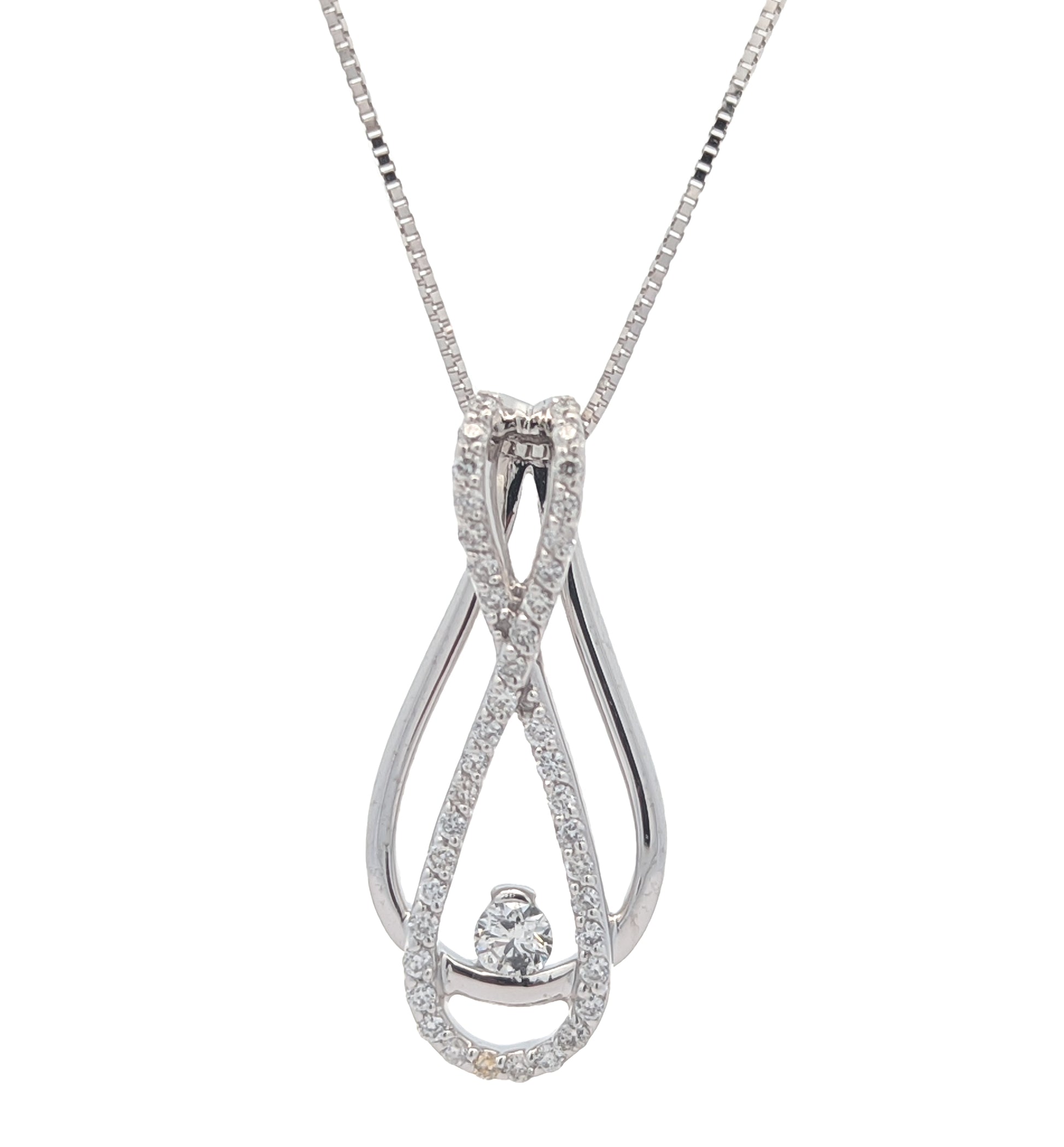 One set stamped 10KT white gold lady's hand assembled custom made diamond pendant and chain. The chain is 18.0" long, light box link with a spring ring clasp. The pendant and chain have a high polish finish. Containing: