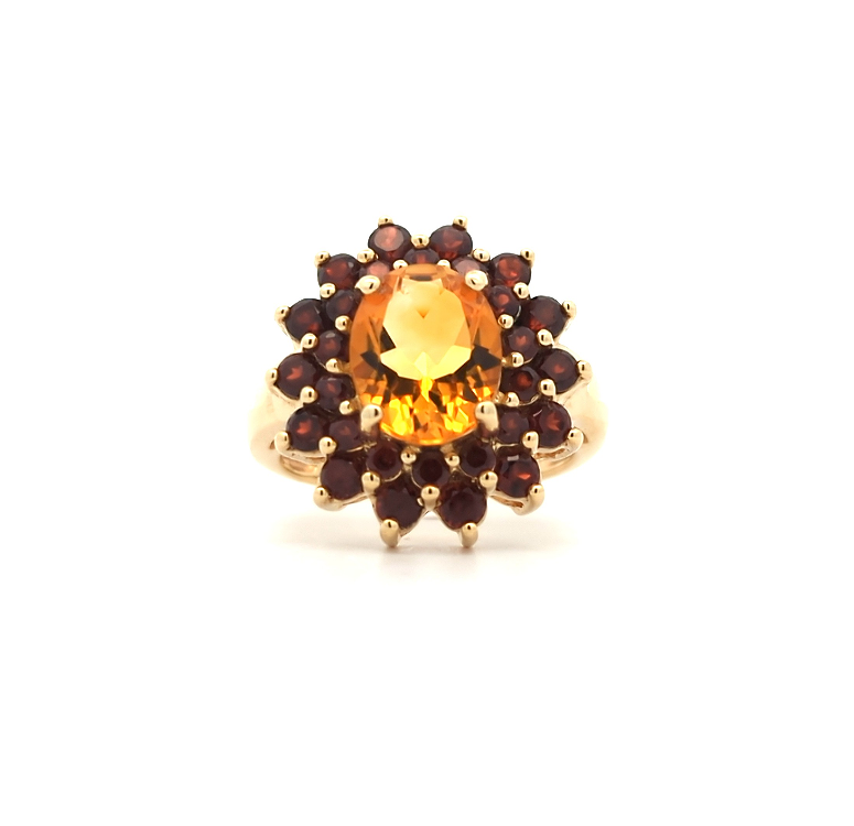 10KT Yellow Gold Natural Almandite Garnet and Natural Citrine Quartz Estate Cluster Ring size 6