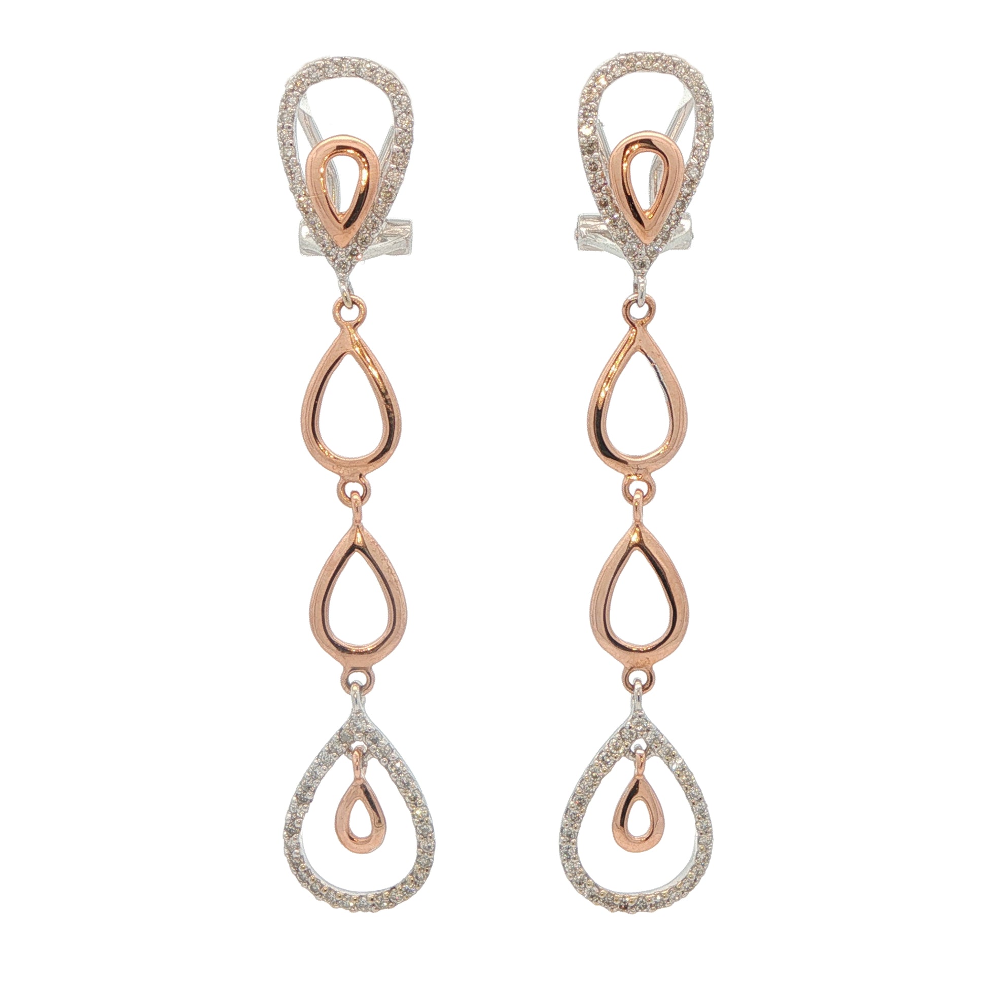 One pair stamped 14KT white and rose gold hand assembled custom made dangle earrings with omega clip backs and a high polish finish. Containing: