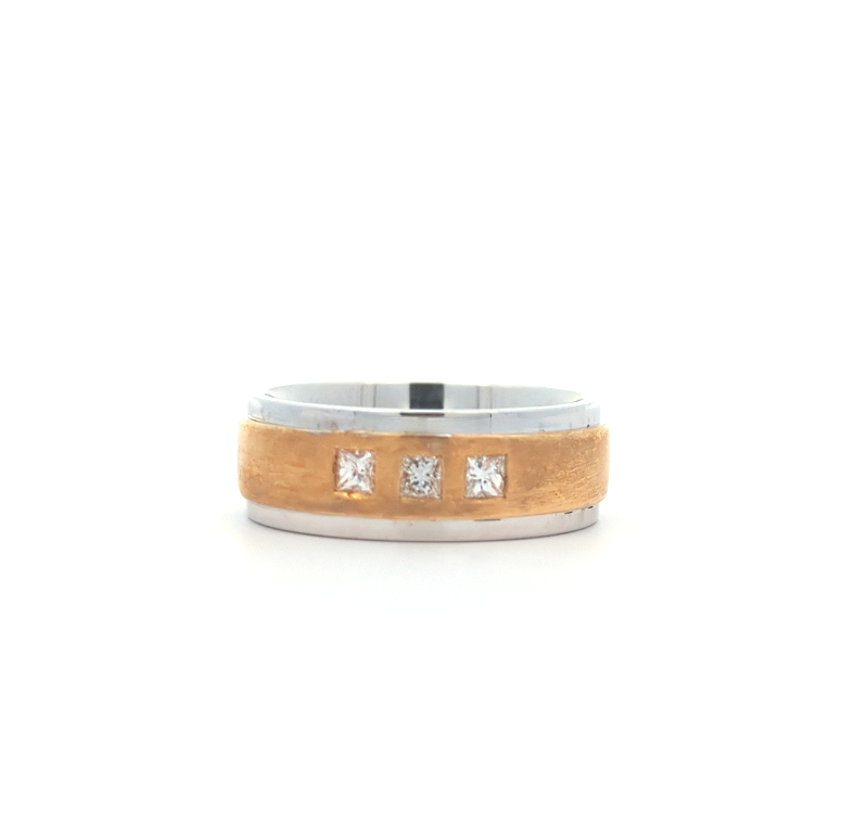 One 14KT white and yellow gold hand assembled custom made diamond band with a brushed and high polish finish.