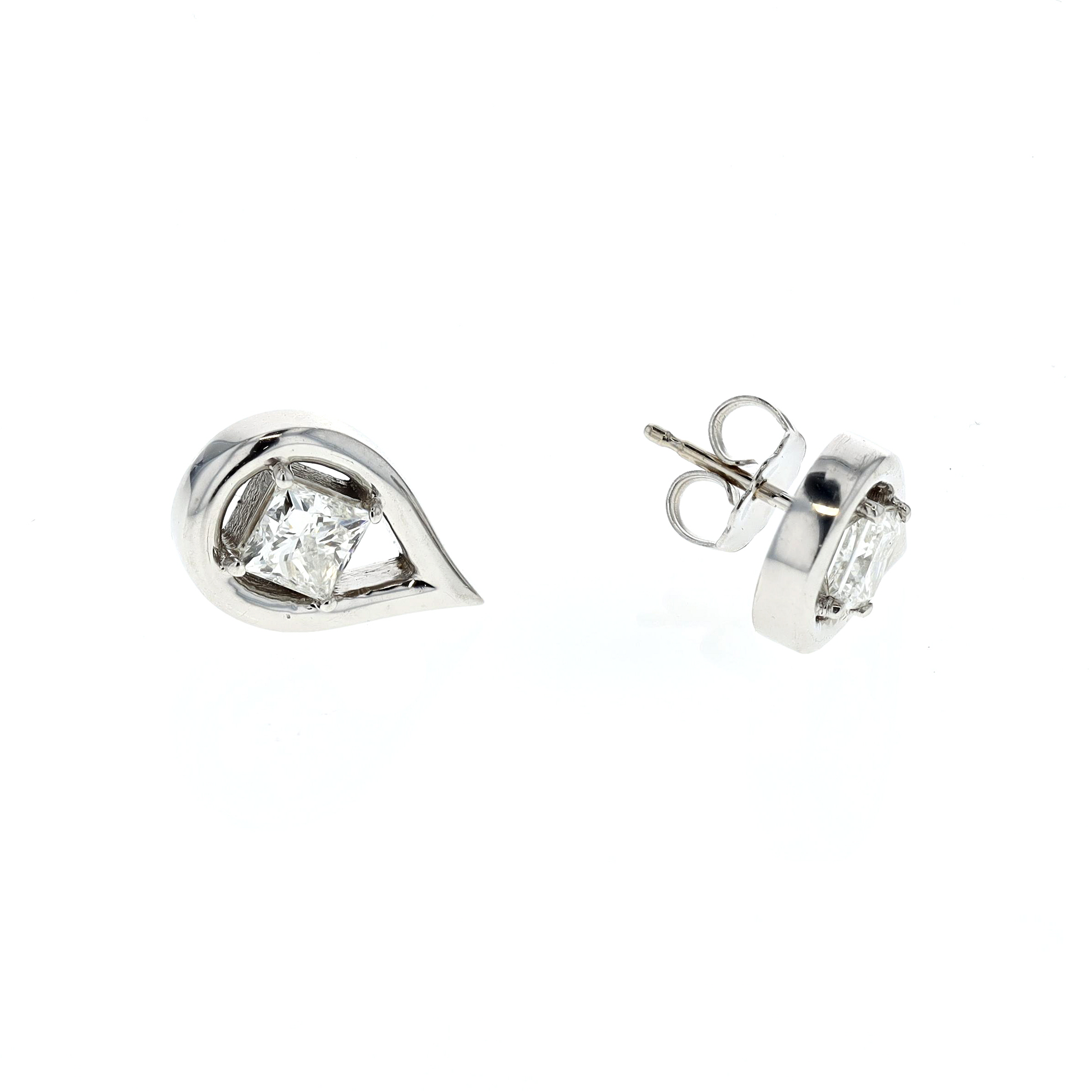 Two claw set princess cut diamonds, measuring 4.30 x 4.20 x 3.15mm (depth est.) approximate total weight of 2 Stones = 0.93ct. One diamond is chipped.