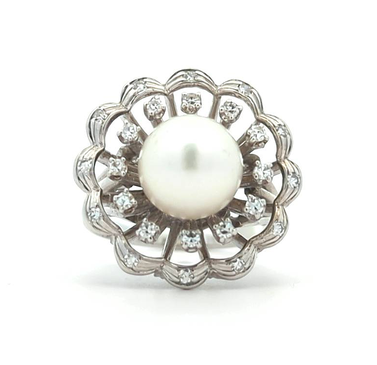 14KT White Gold Akoya Cultured Pearl Diamond Estate Cocktail Ring size 5