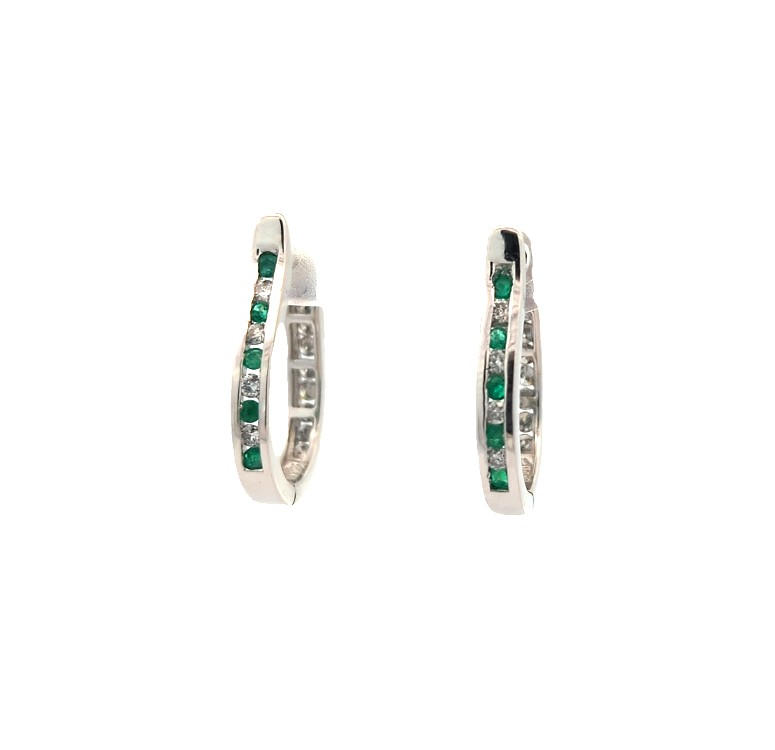 14KT White Gold Natural Emerald and 0.49ctw Diamond Estate Hoop Earrings