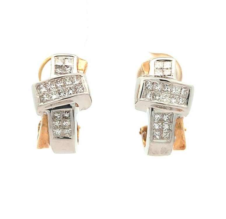 One pair 14KT yellow and white gold hand assembled custom made earrings with omega clip backs with a high polish finish.