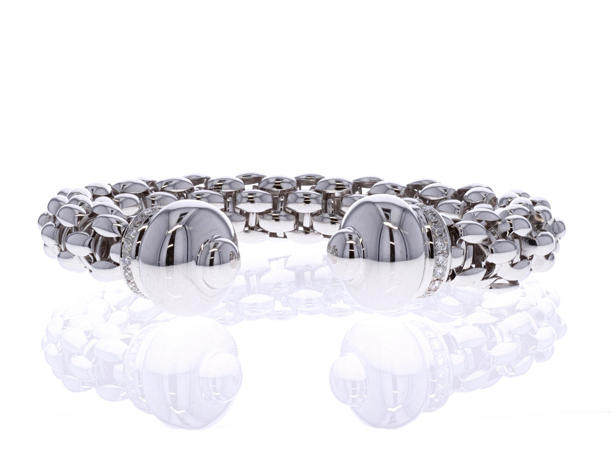 One lady's 750 (Stamped) white gold Italian made fancy design diamond bangle bracelet, containing: