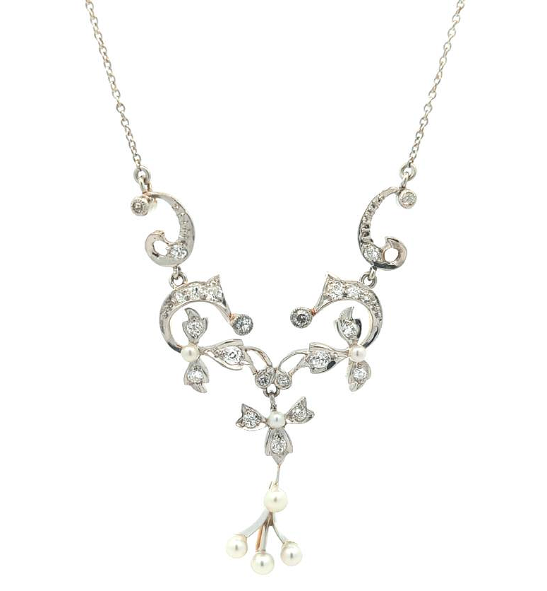 Platinum and 14KT Yellow Gold Akoya Pearl and 0.76ctw Diamond Estate Floral Necklace